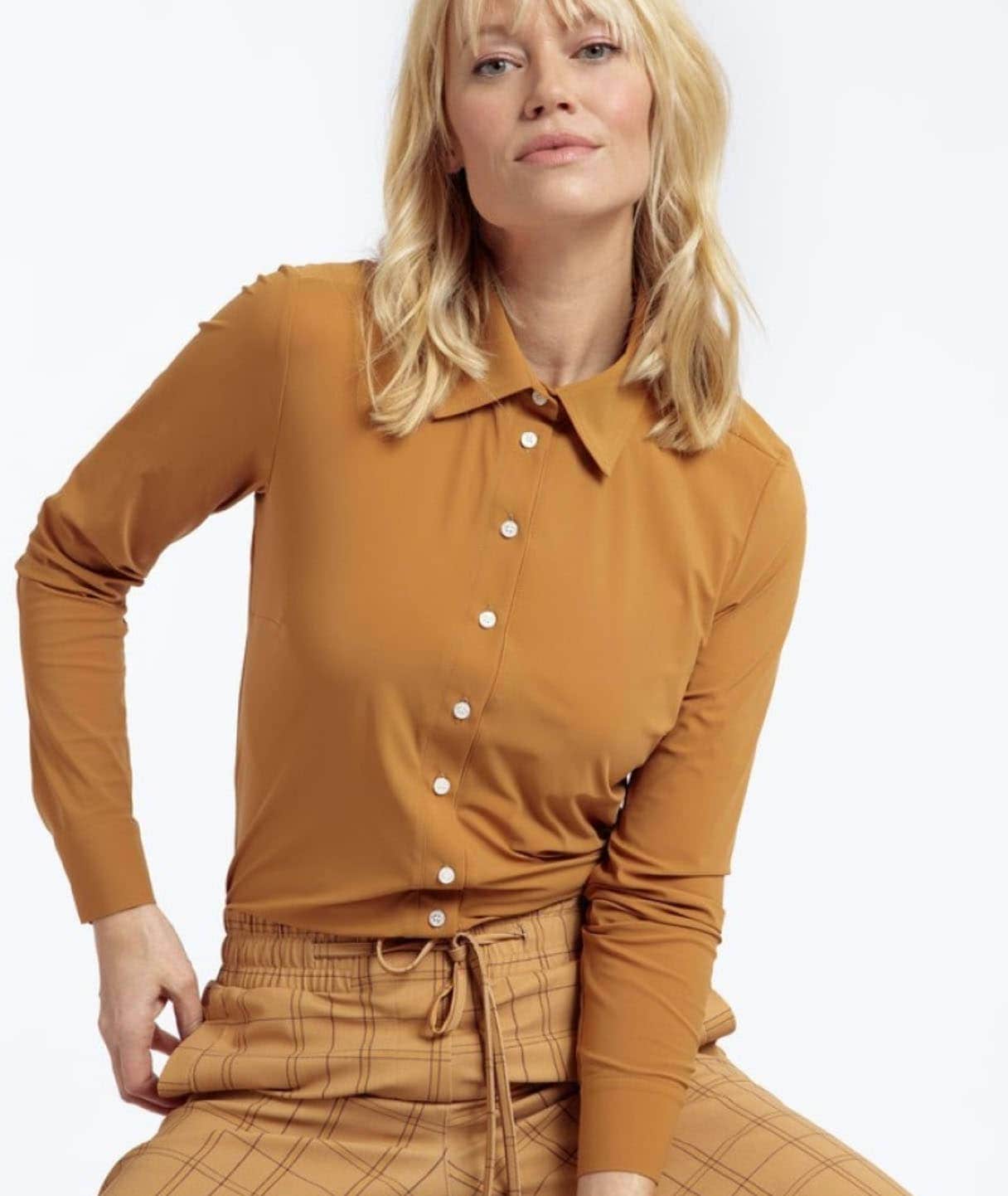 Een populaire Studio Anneloes travelstof blouse is de POPPY. Elke maand ontvangen we een nieuwe drop met een nieuwe thema. Hier zit altijd weer een leuke nieuwe variant van de POPPY blouse bij. Nu is dat bijvoorbeeld deze camouflage print met geeltinten. Super leuk om te combineren met deze bijpassende broek.