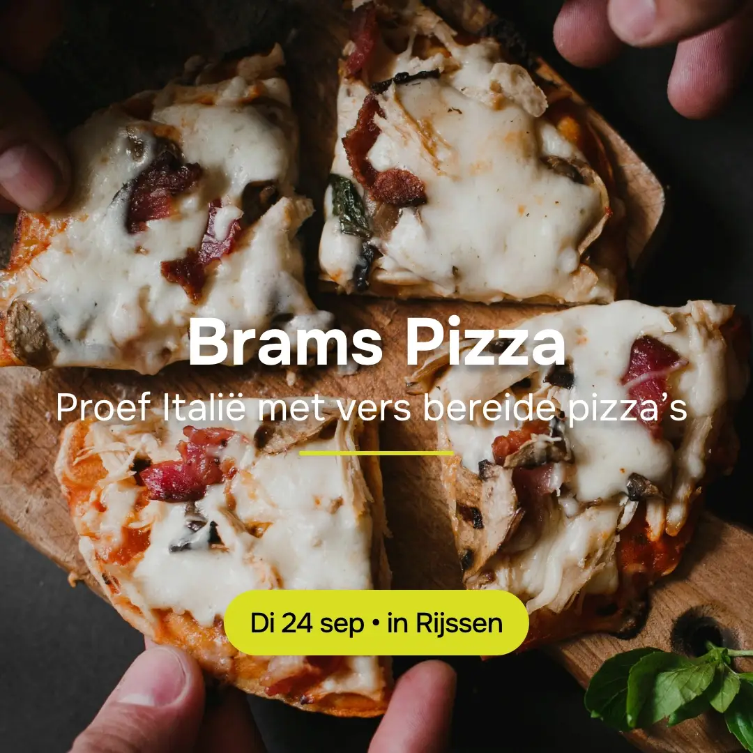 Heb je ooit gezien hoe een verse pizza wordt bereid? Nu is je kans! Bram brengt ons deze avond ’the taste of Italy’. Gedurende de hele avond bakt hij verschillende pizza’s af en laat hij je graag een puntje proeven.