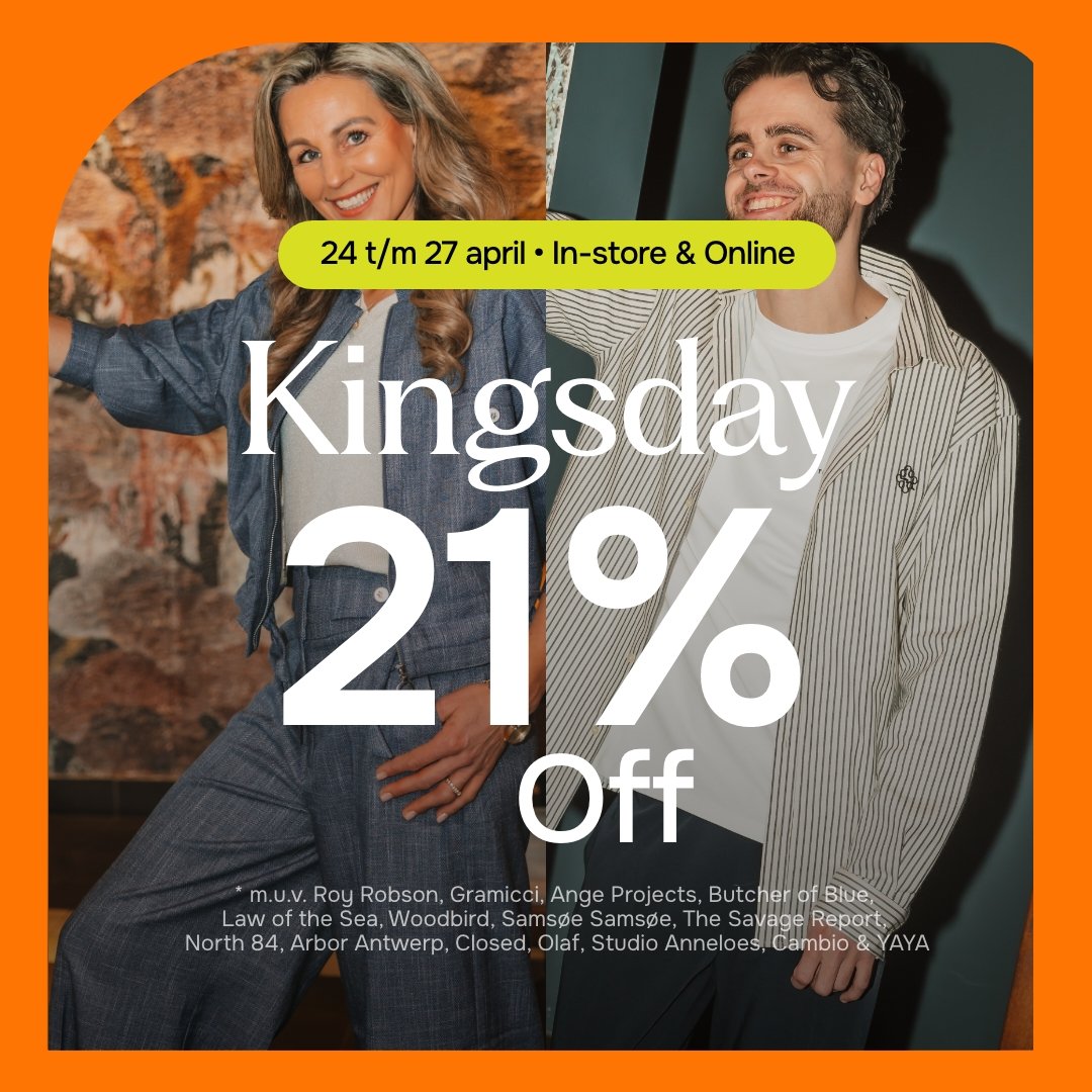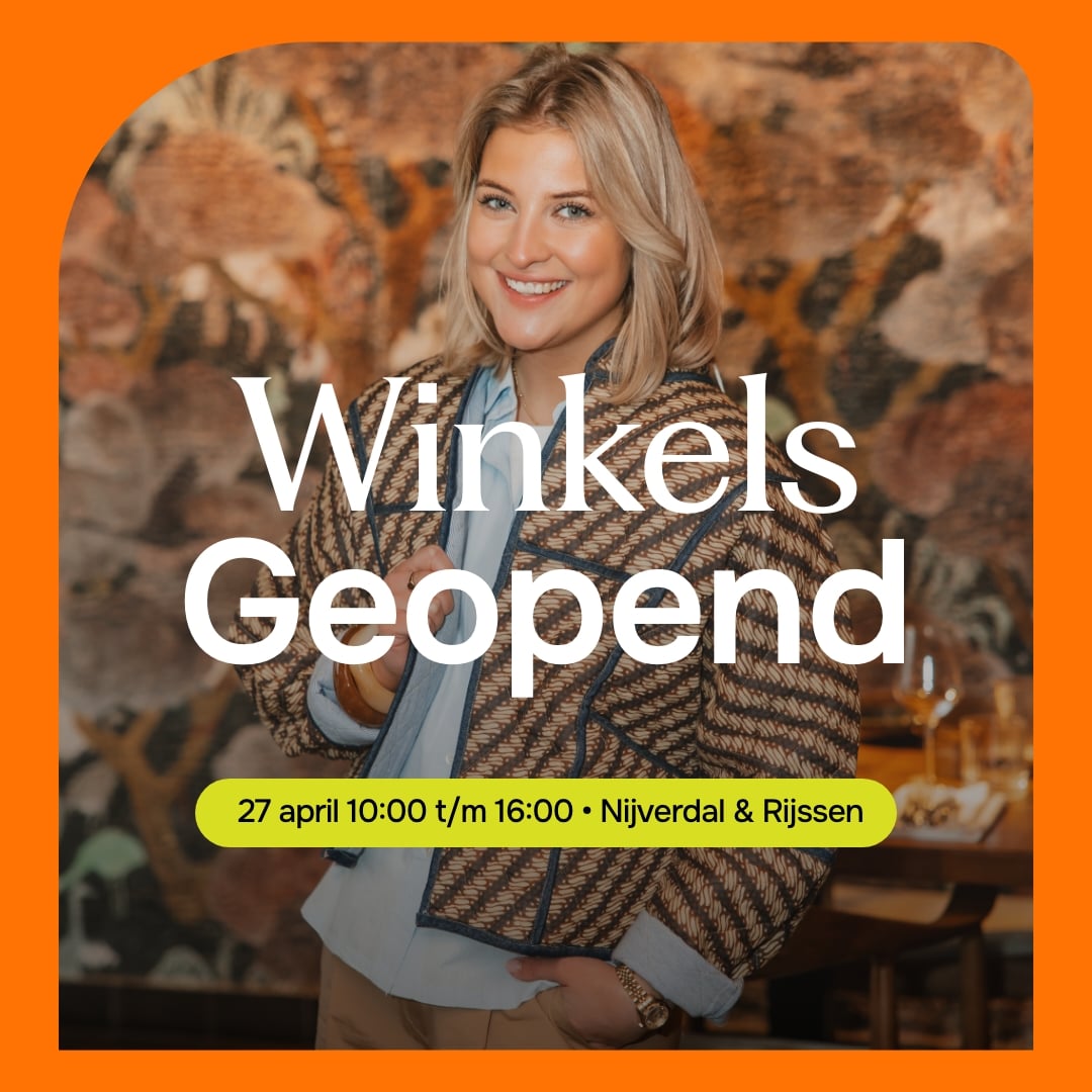Om het extra feestelijk te maken, hebben wij een speciale actie: 21% Koningsdagkorting op (bijna) onze hele collectie. Je shopt deze korting zowel online als in onze winkels in Nijverdal en Rijssen. Je hoeft niet te wachten tot maandag, want de actie start al online op vrijdag 24 april om 19:00 uur en loopt door t/m maandag 27 april 23:59 uur. In de winkels profiteer je zaterdag en maandag van deze actie.