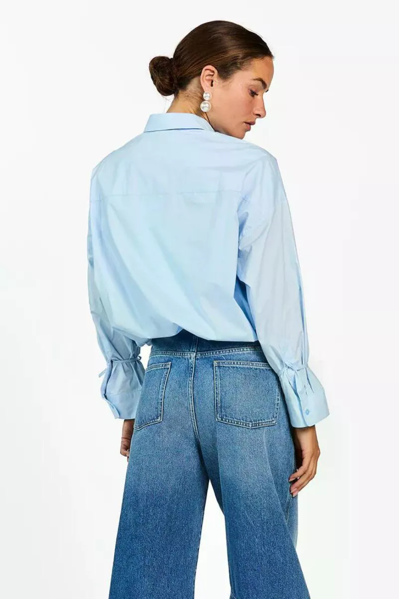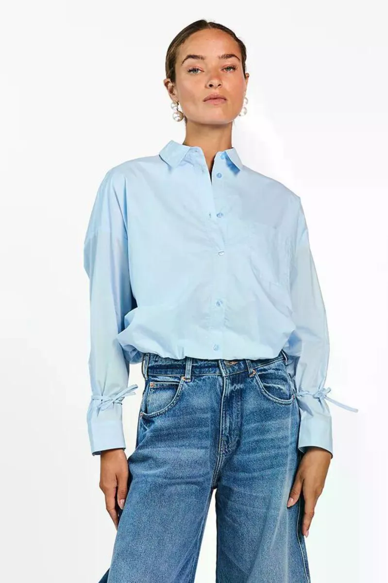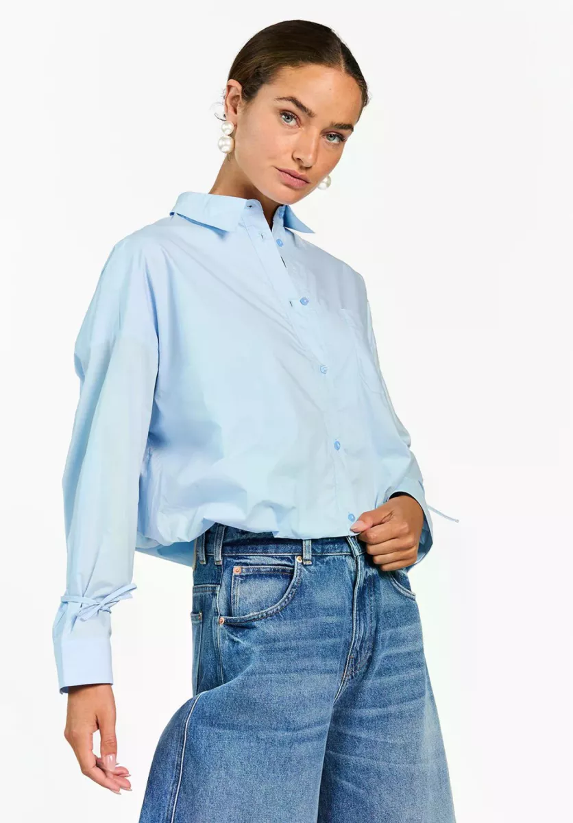 De Mikkie Blouse is een luchtige poplin blouse met een casual fit en klassieke kraag. De mouwen zijn afgewerkt met smalle strikkoorden bij de manchetten, wat zorgt voor een subtiel detail. Dankzij de rechte snit valt de blouse losjes om het lichaam en is hij makkelijk te combineren. Draag met de Sacha Barrel jeans voor een relaxed everyday look.