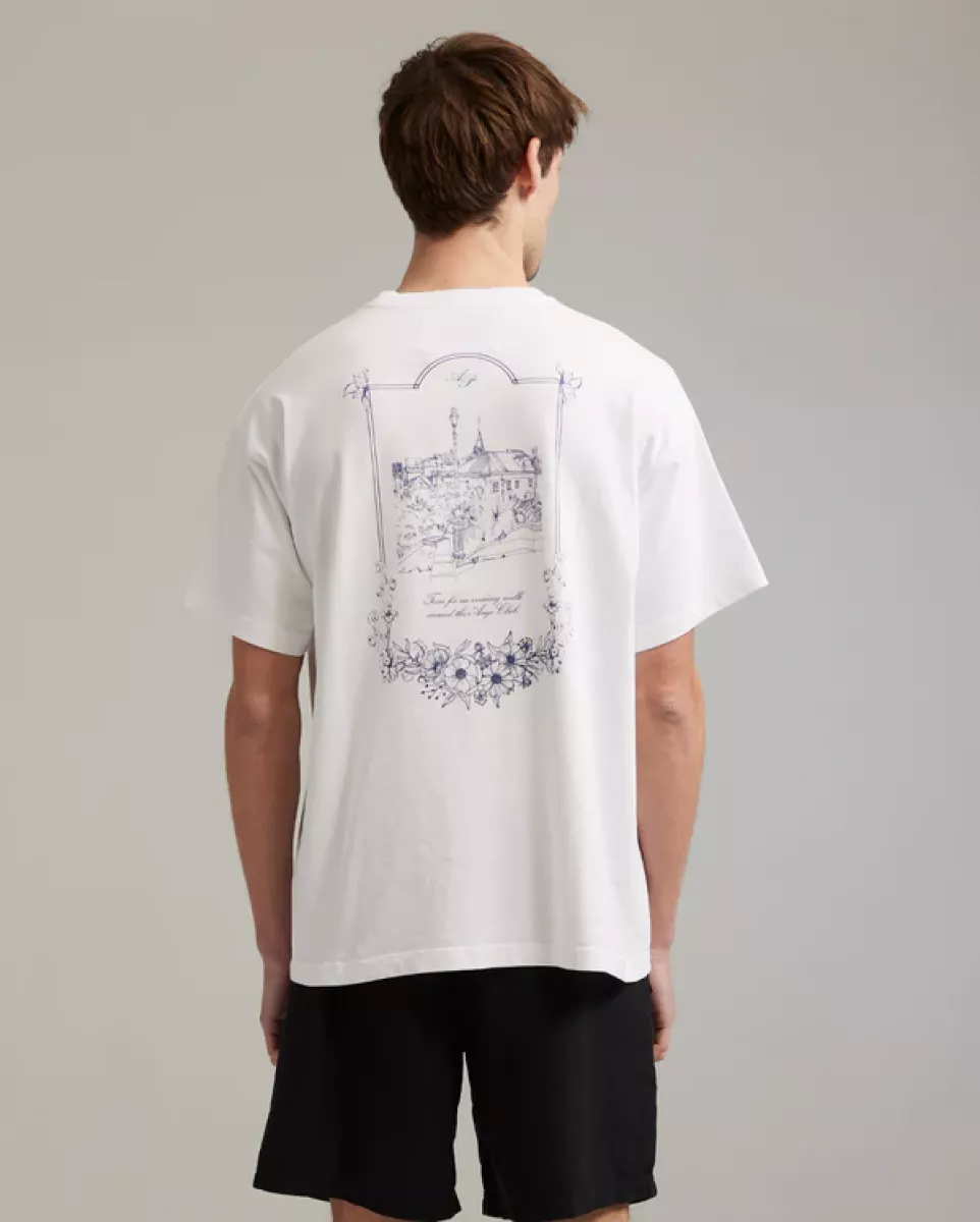 • T-shirt with a ribbed collar. This style features a screen print at the back and front hip.