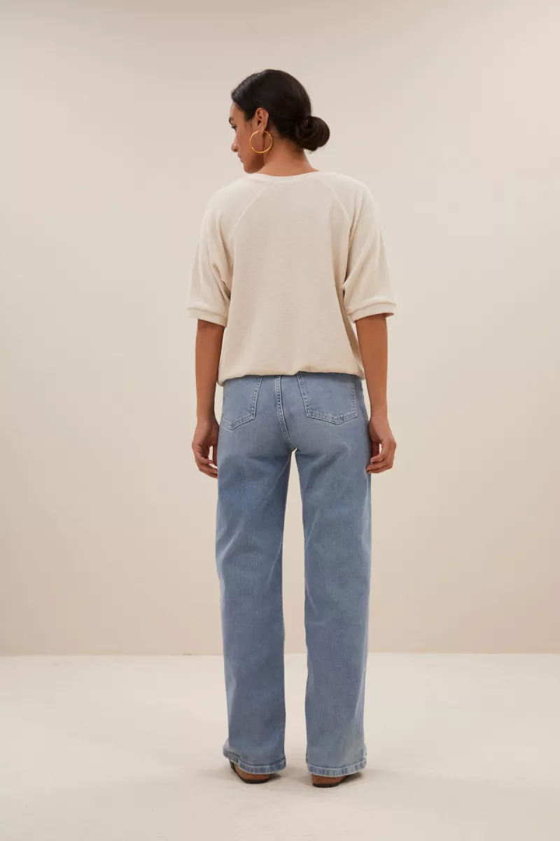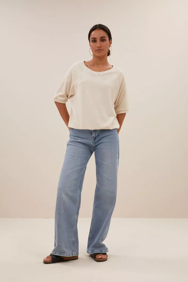De neva slub top is een comfortabele top met een ronde halslijn. De top heeft een korte mouw en is afgewerkt met een rib boord aan zowel de onderkant van de mouwen als aan de onderkant van de top. Daarbij zit er een splitje aan beide zijkanten van de top. De top is gemaakt van een fijne blend van biologisch katoen en gerecycled polyester en is een echte must-have essential.