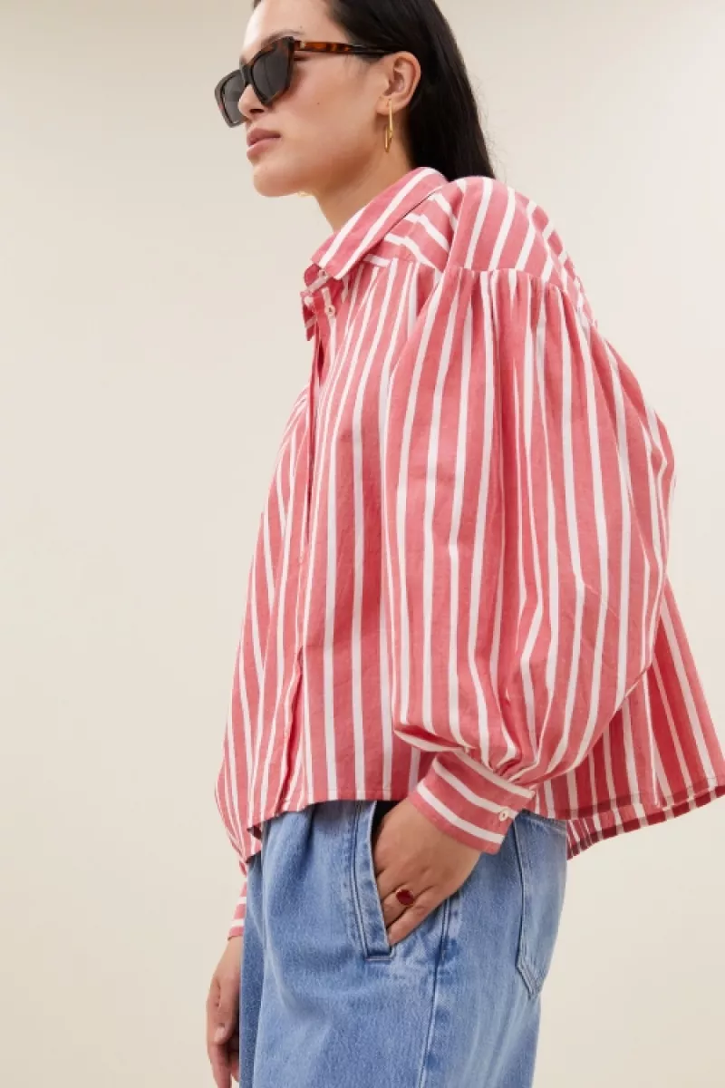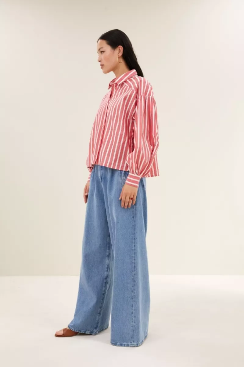 De sarah short stripe blouse combineert een casual uitstraling met duurzame productie. Deze blouse heeft een losvallende pasvorm en een korte fit, perfect voor een ontspannen, moderne look. Dankzij de klassieke kraag en knoopsluiting draag je dit item moeiteloos. De lange mouwen en het gestreepte patroon maken het een veelzijdige toevoeging aan je garderobe.
