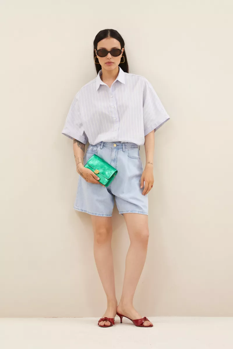 Elisa denim shorts bieden een casual look met een normale taille en pasvorm, perfect voor dagelijks draagcomfort. Deze shorts zijn voorzien van een handige rits- en knoopsluiting en vijf praktische zakken. Ideaal voor wie op zoek is naar een tijdloze en veelzijdige toevoeging aan de zomergarderobe.