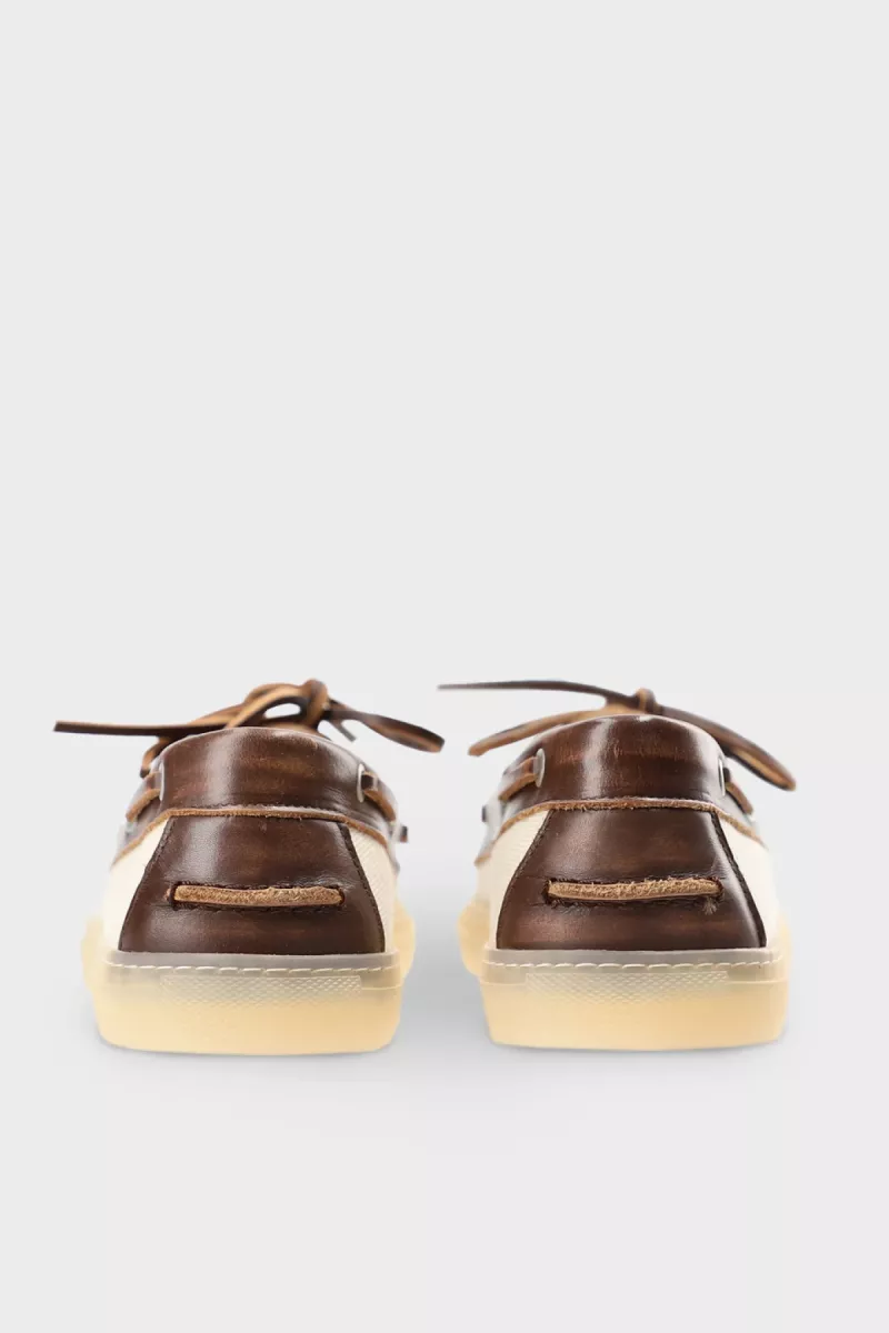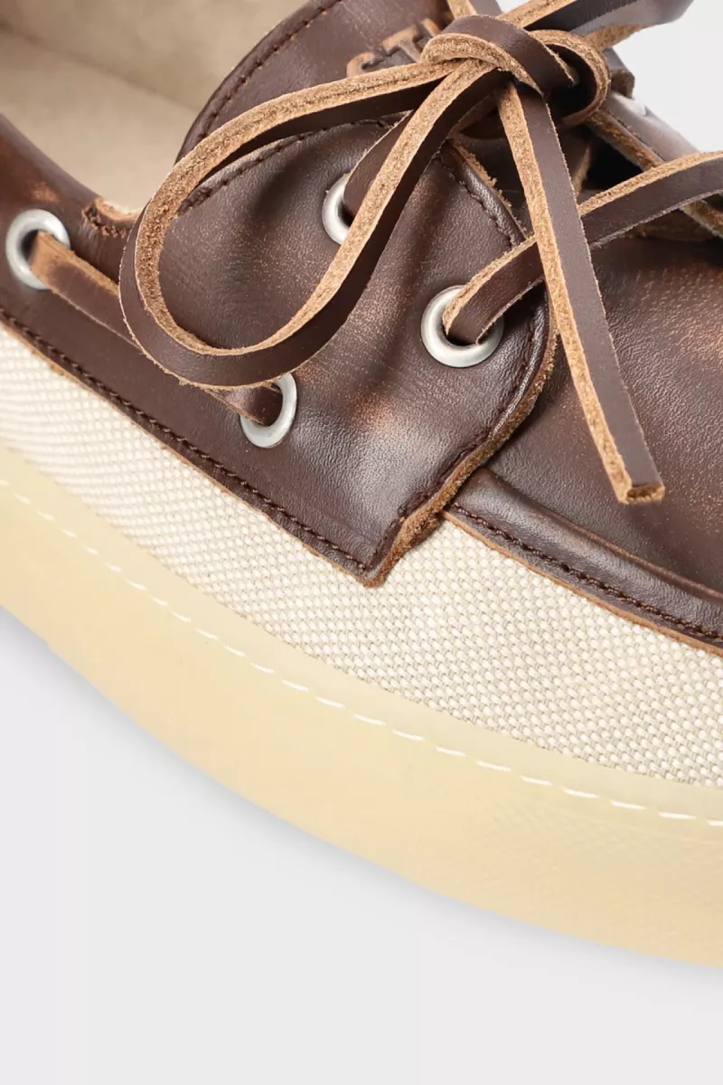 Deze bootschoenen, gemaakt van een mix van materialen, imponeren met hun relaxte silhouet. Verfijnd borduurwerk, een opvallende naad aan de voorkant en subtiele logo-details geven ze een elegante uitstraling. De instappers met decoratieve veters en metalen details maken ze tot moderne loafers, perfect voor een casual zomerlook.