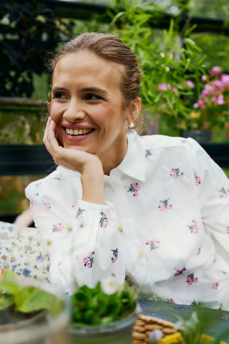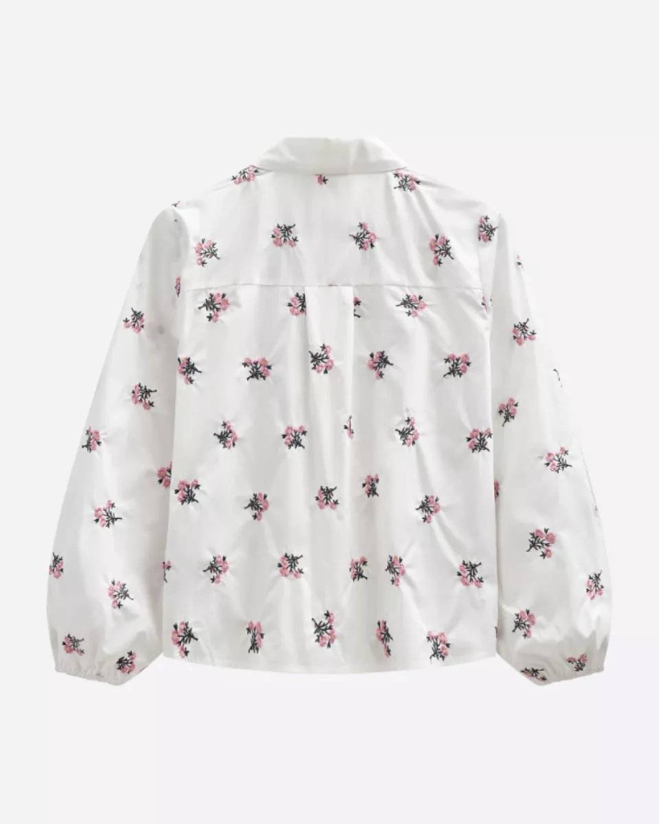 Blouse van Freequent in een lichte stof met geborduurde bloemen over de hele stof voor een prachtige look. De blouse heeft lange mouwen met elastische manchetten, een knoopsluiting aan de voorkant, splitten aan de zijkanten en een losse pasvorm.