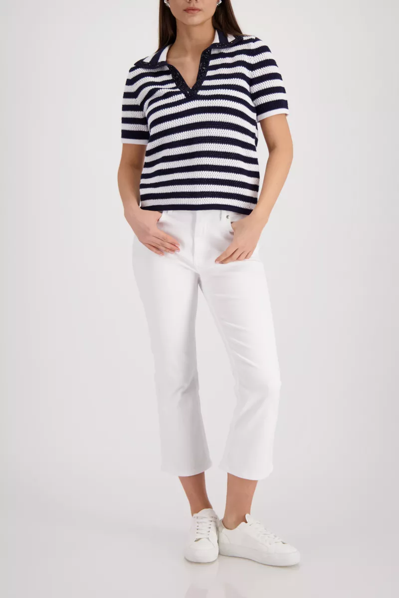 Monari – Ajour polo jumper with rhinestones – 410906 – 756 Marine striped