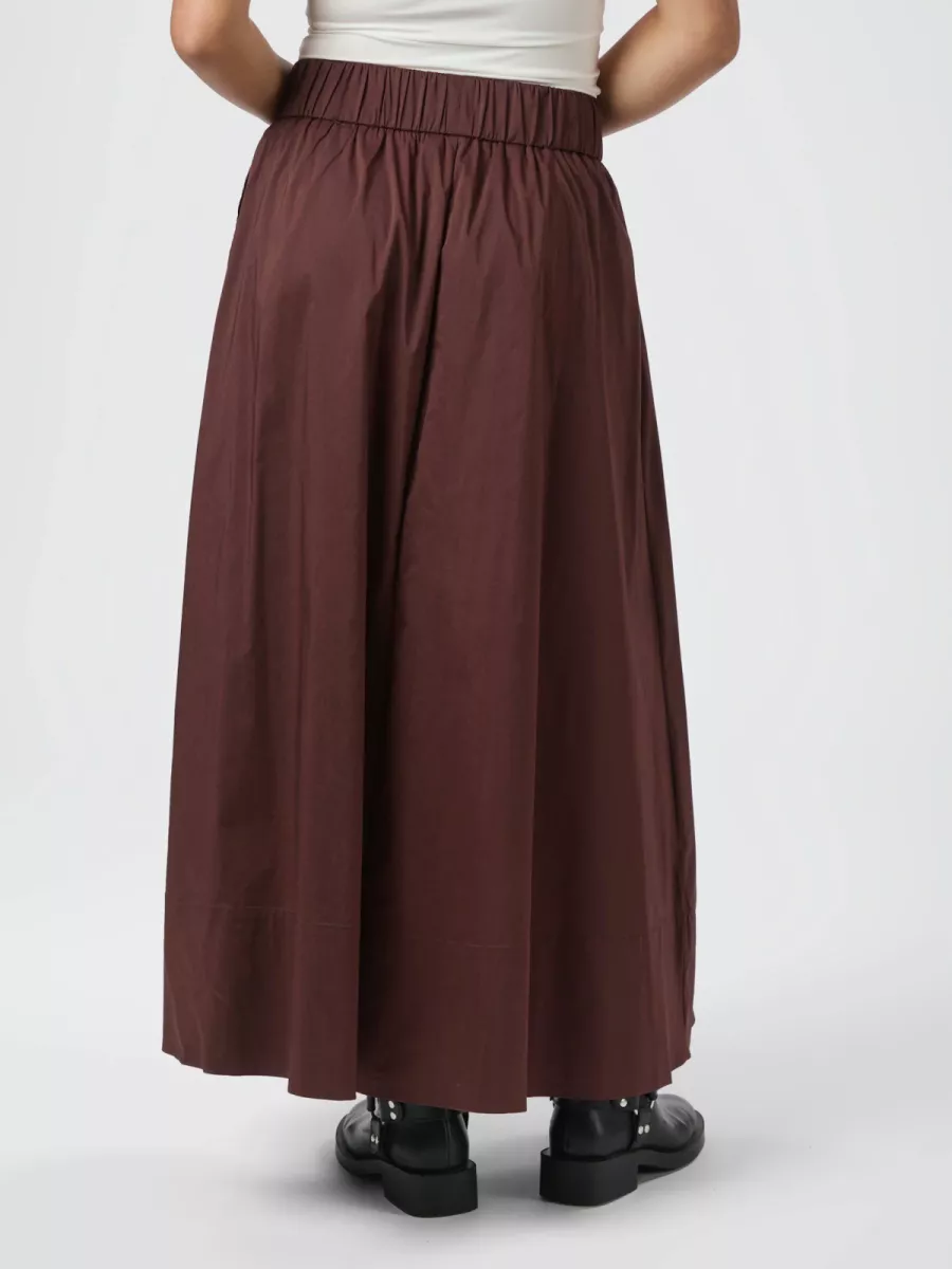 Midi-lengte rok in een zachte poplin kwaliteit, die halverwege de kuit stopt, met een hoge elastische tailleband en zakken aan de voorkant.