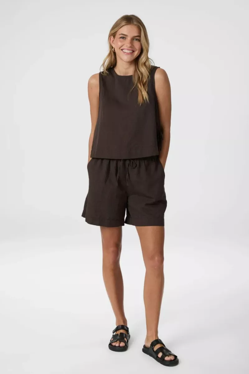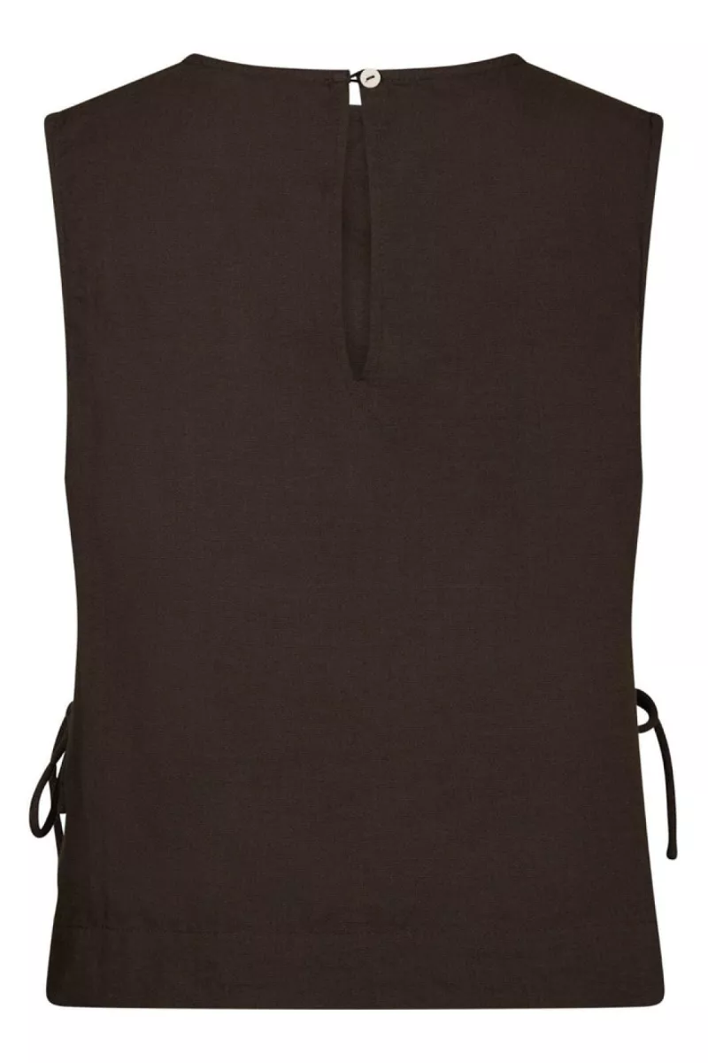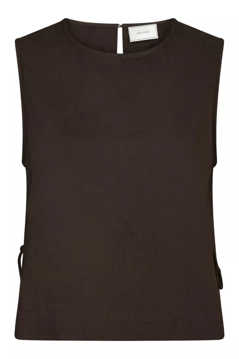 - Donkerbruin linnen top van Neo Noir met ronde halslijn. Een mouwloze top met een split aan de zijkant en een bindband waarmee de pasvorm kan worden aangepast.