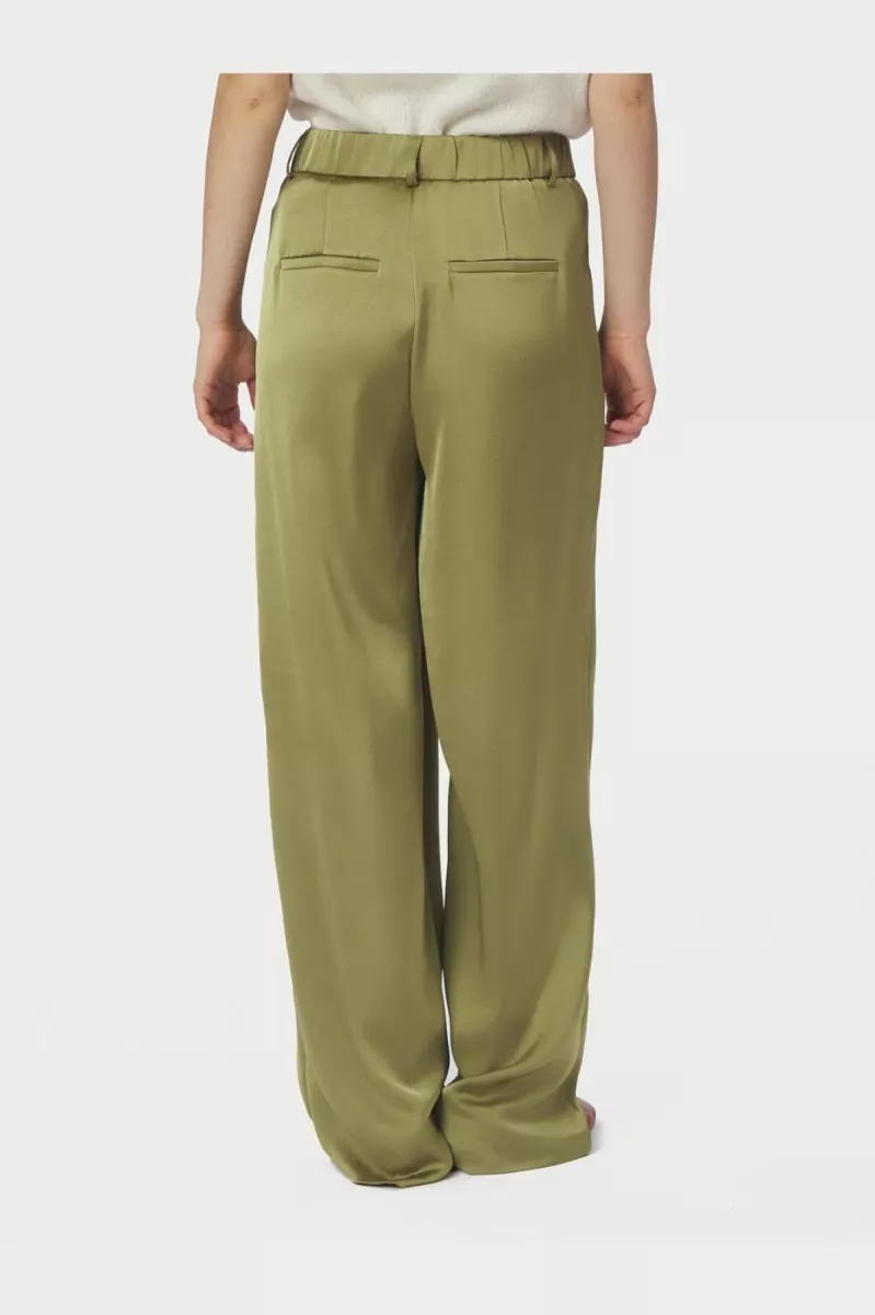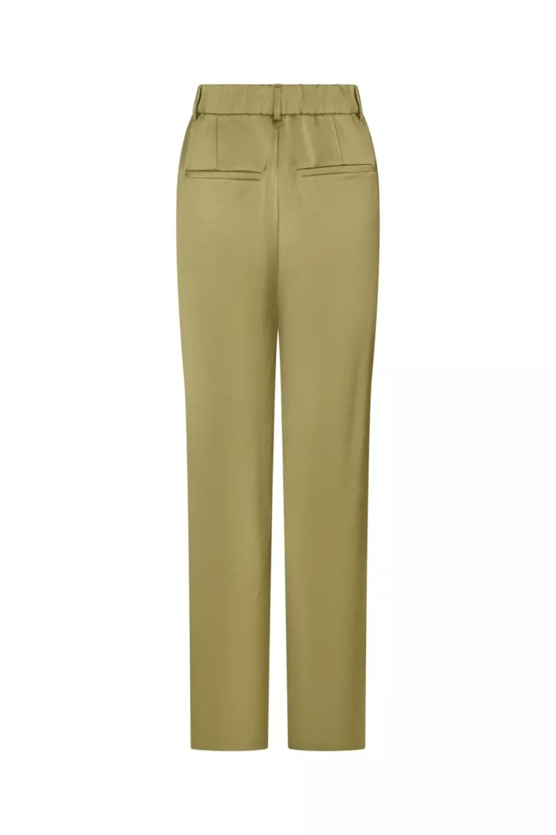 Broek van Neo Noir, gemaakt van een stevige satinkwaliteit in een moderne saliegroene tint. De broek heeft een hoog getailleerd ontwerp met wijde pijpen.