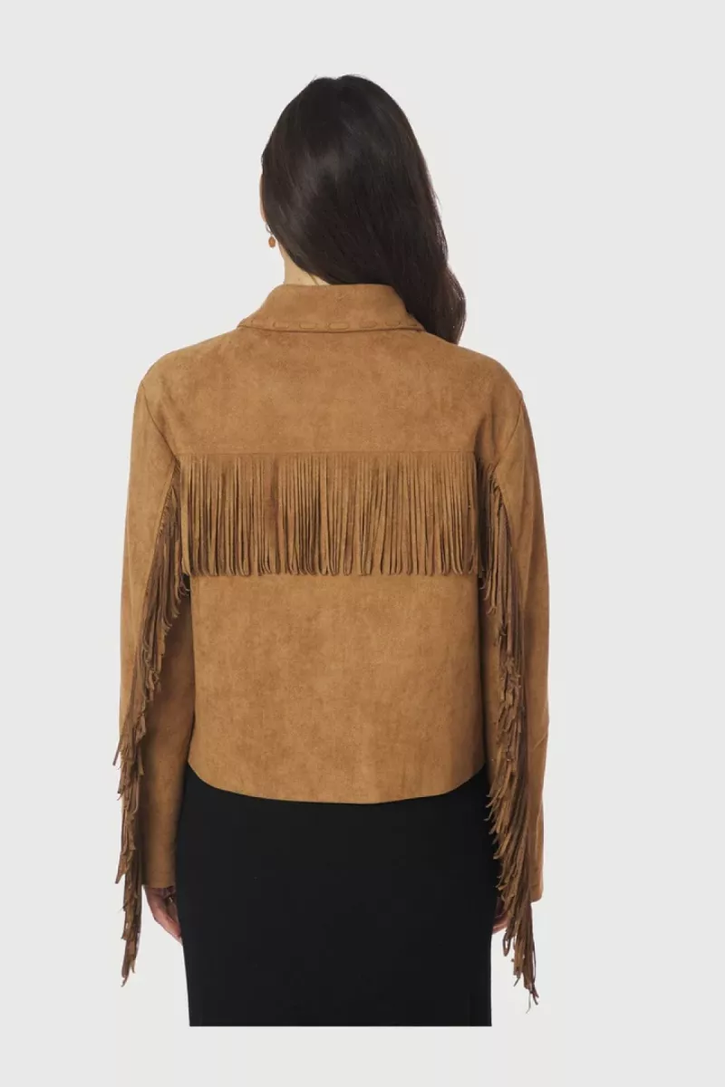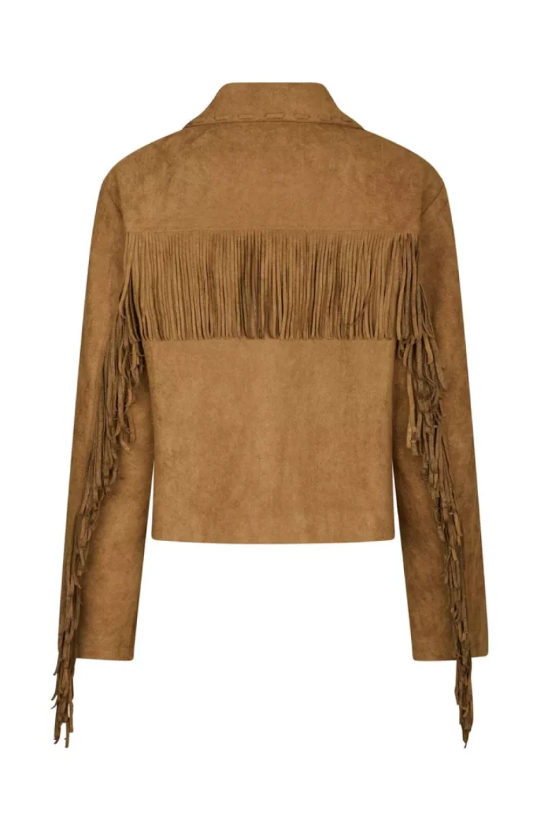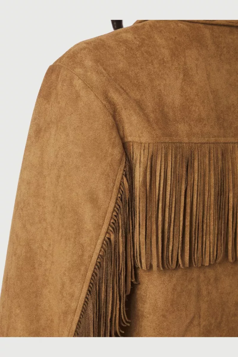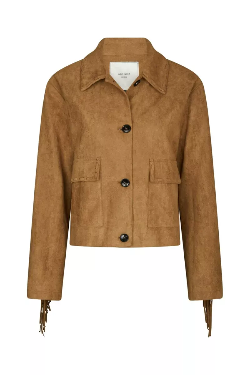 - Cognackleurige jas van Neo Noir in imitatie suède met franjes langs de mouwen en op de rug. De jas heeft een overhemdkraag, grote knopen aan de voorkant en decoratieve stiksels op de kraag en zakken.