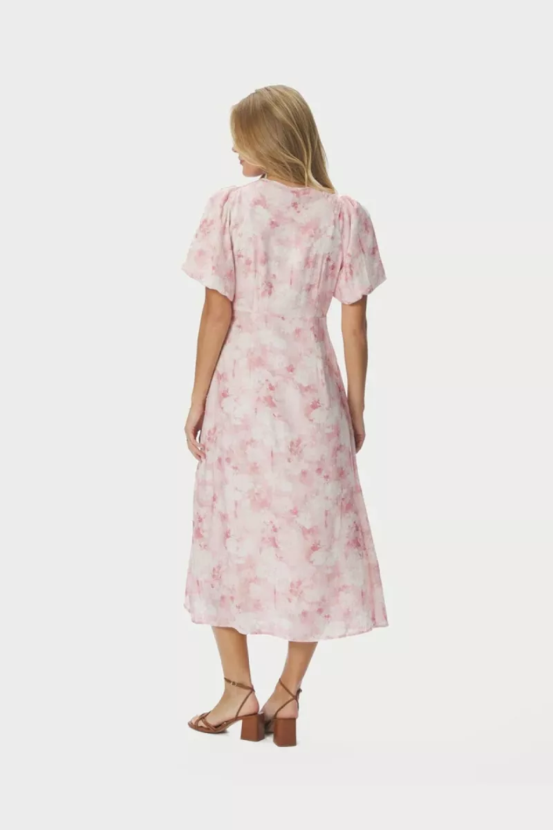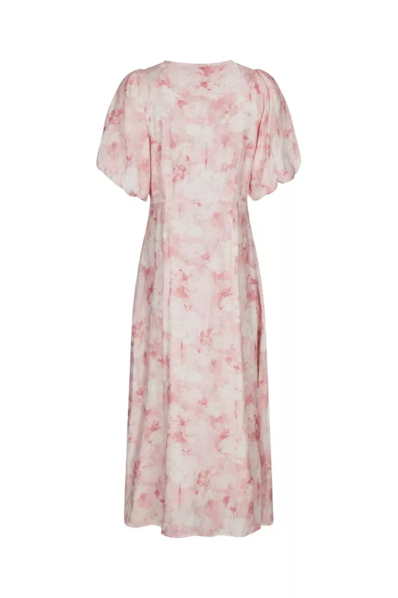 - Roze jurk van Neo Noir met bloemmotief. De jurk heeft ruches, een V-hals en een losse pasvorm.