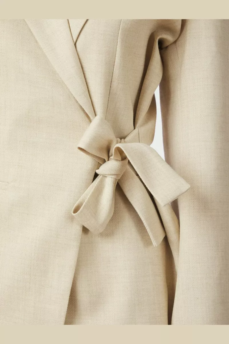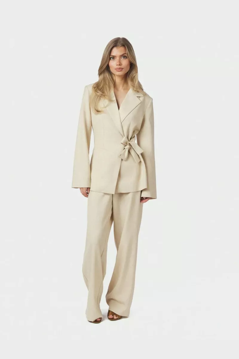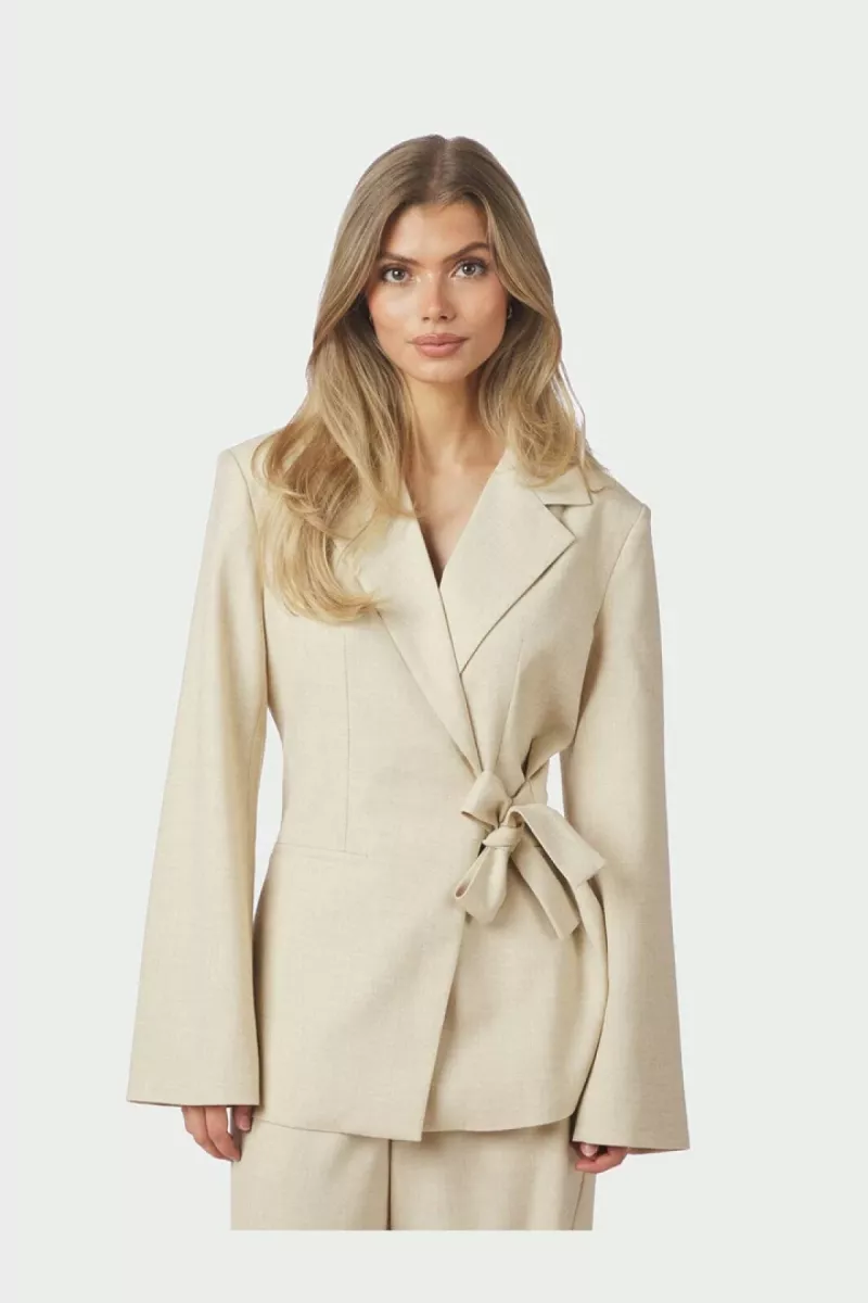- Beige melange-blazer van Neo Noir met strikceintuur in de taille. De blazer heeft een reverskraag en een schuine sluiting aan de zijkant.
