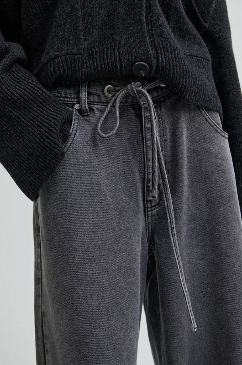 Second Female jeans with belt. The jeans are made in soft, drapy lyocell. Featuring a concealed zip fastening and button at the front and drawstring with tie fastening at the waist. Five-pocket style. Mid waist with loose, straight leg.