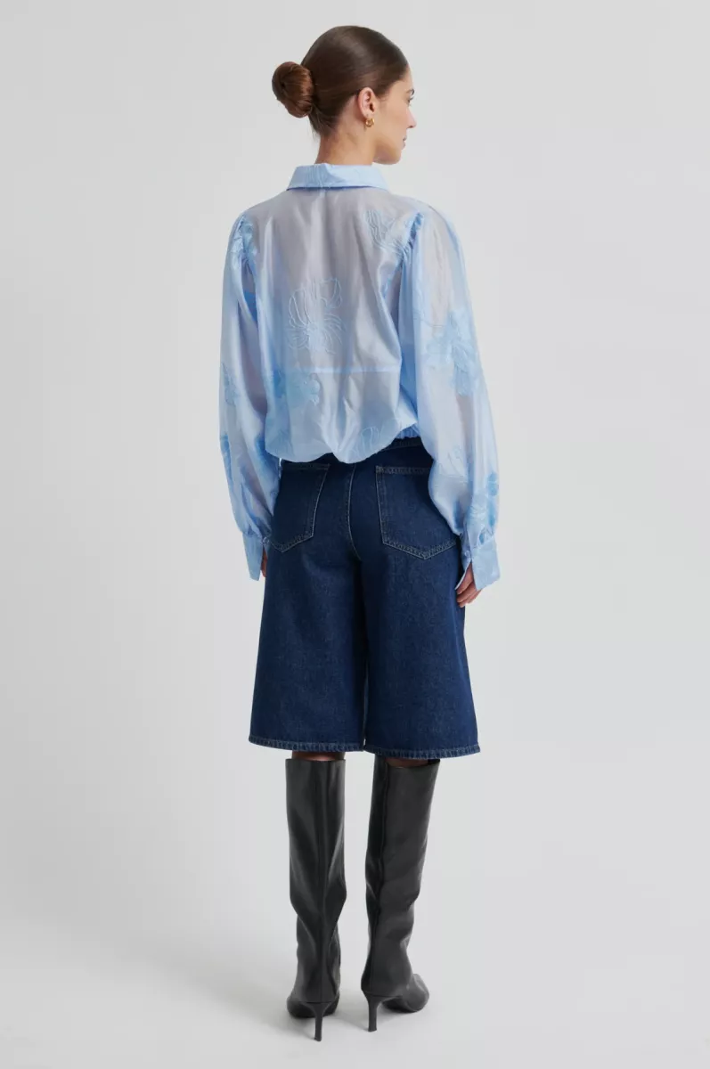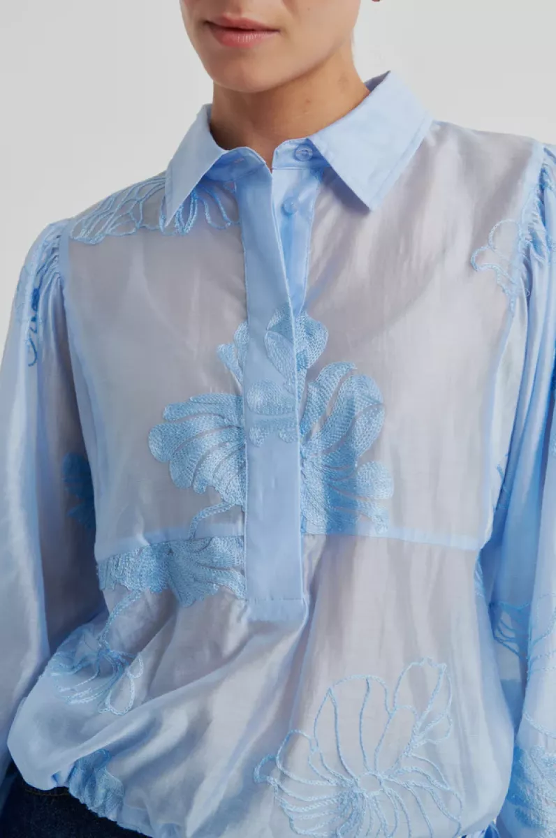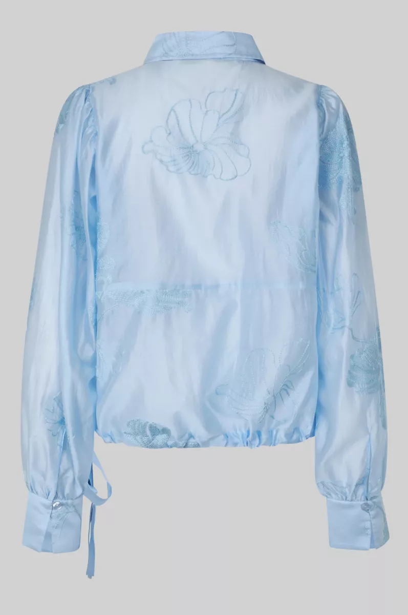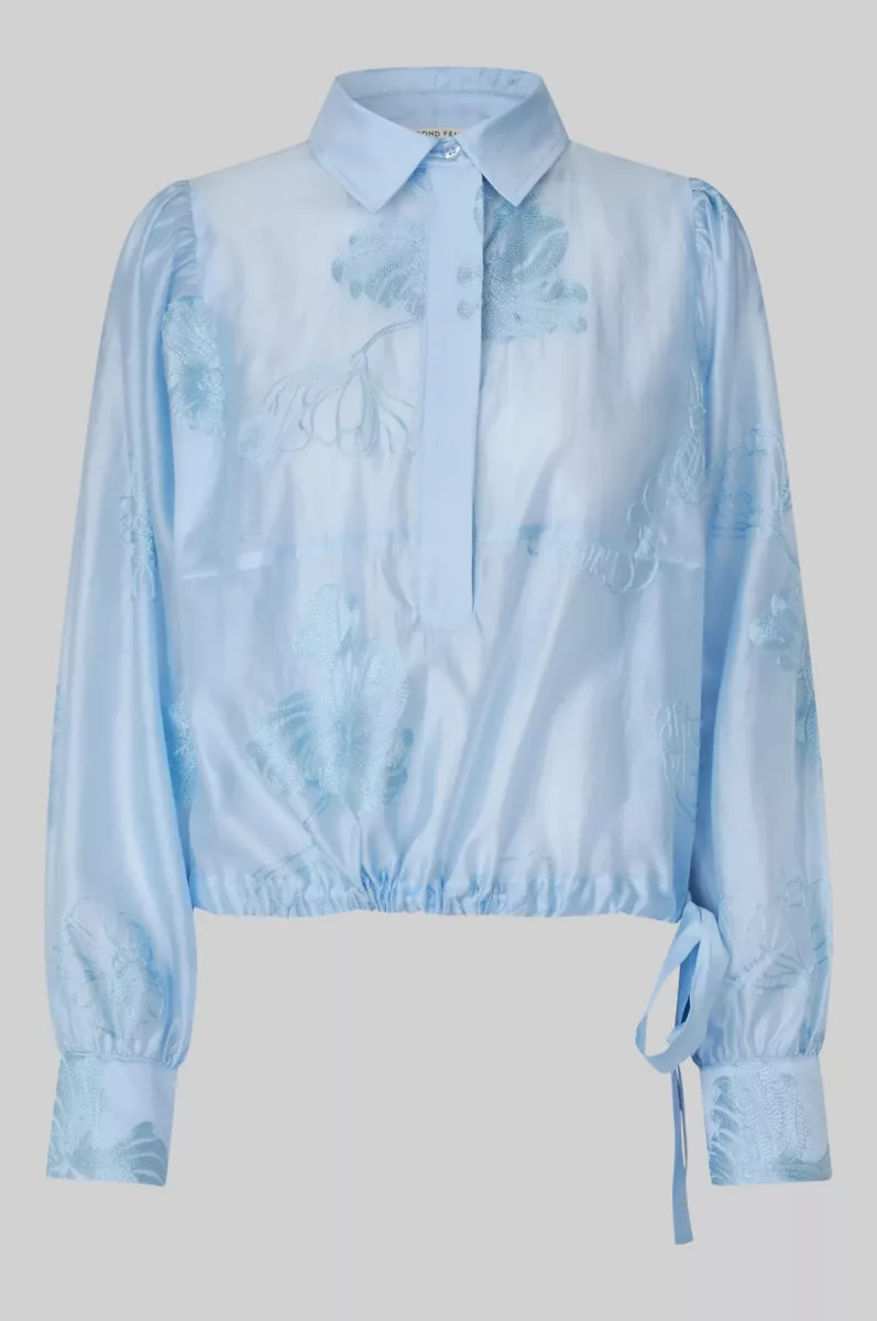 Second Female blouse with embroidery. The blouse is made in a semi-sheer fabric with tonal embroidery. Featuring a regular collar and concealed button fastening. Long sleeves with buttoned cuffs. Drawstring tie at waist hem with ribbon.
