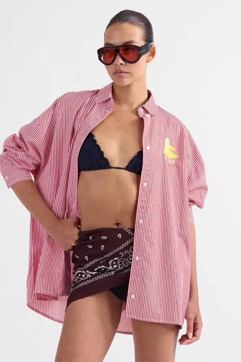 De STIEGLITZ Lua Blouse in rood geeft een speelse draai aan het klassieke streeppatroon. Met zijn ontspannen pasvorm en rood-witte strepen biedt deze blouse een tijdloze basis, terwijl het banaan-borduursel zorgt voor die unieke Stieglitz flair.