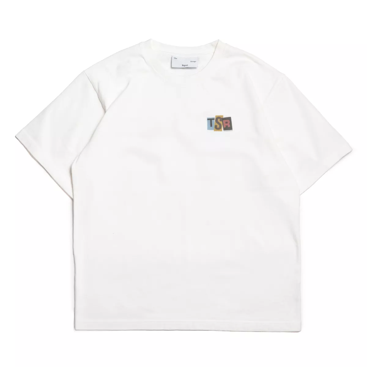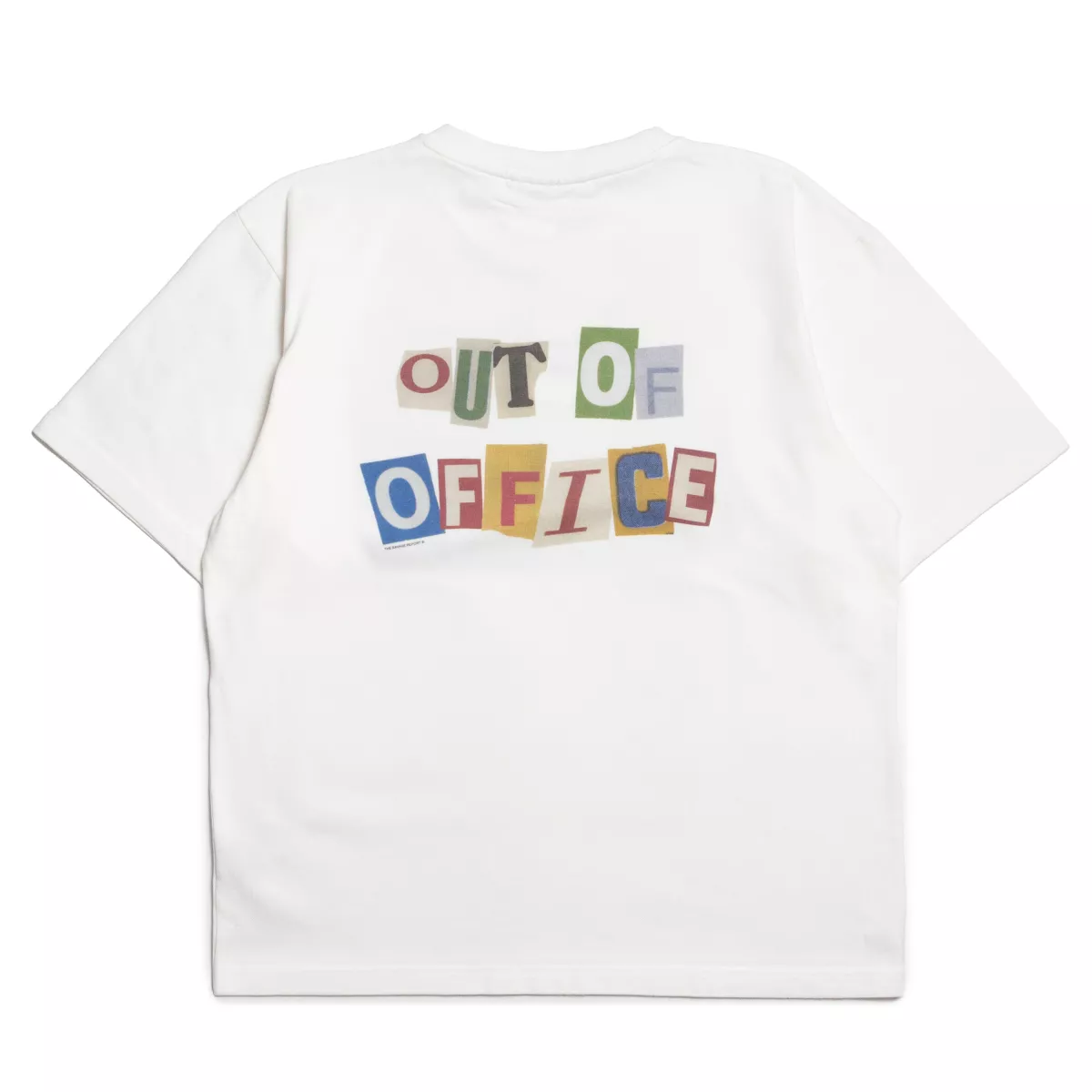 Normale pasvorm met ronde hals, afgewerkt met het TSR-logo in krantenstijl op de borst en de “Out of Office”-afbeelding op de achterkant.