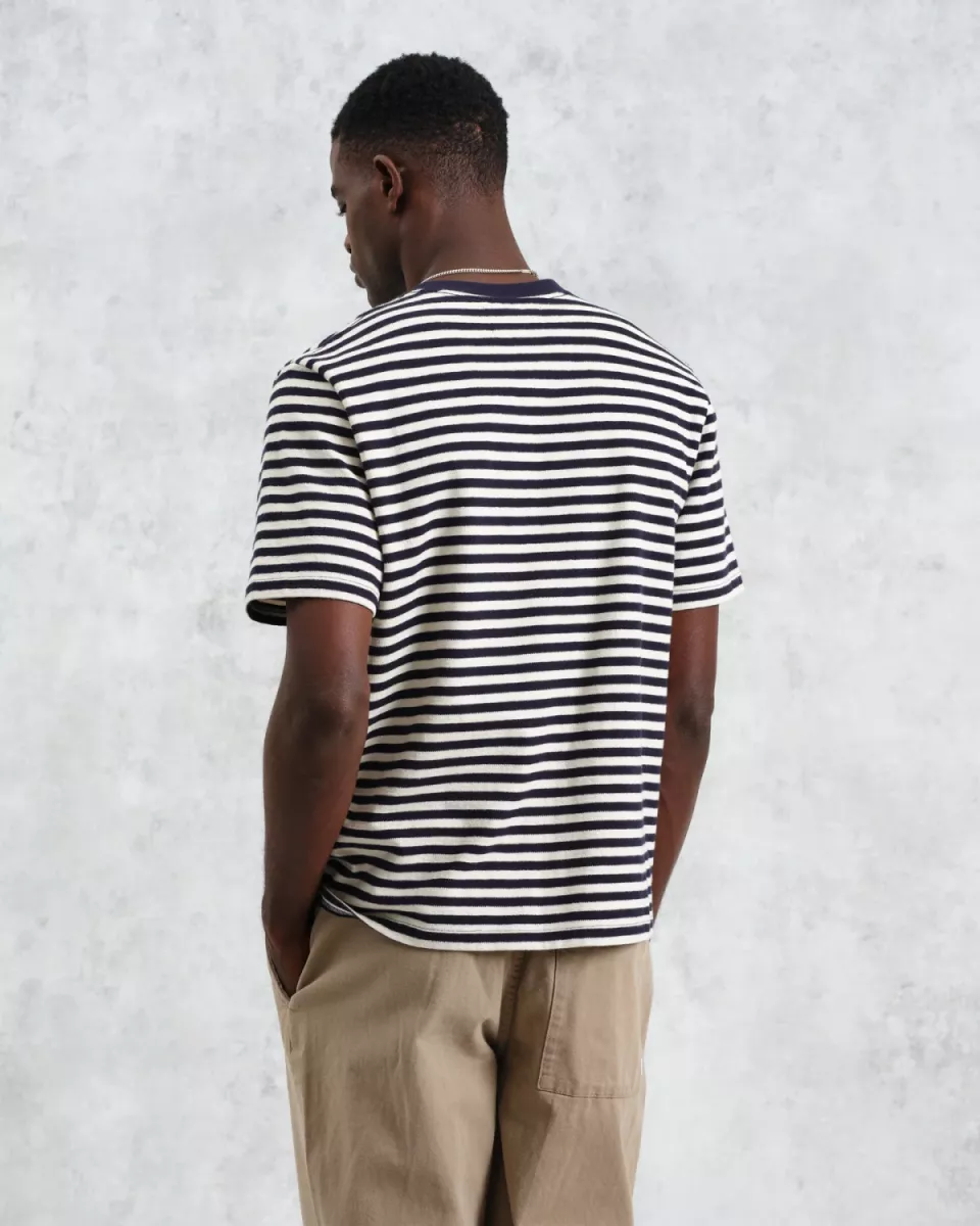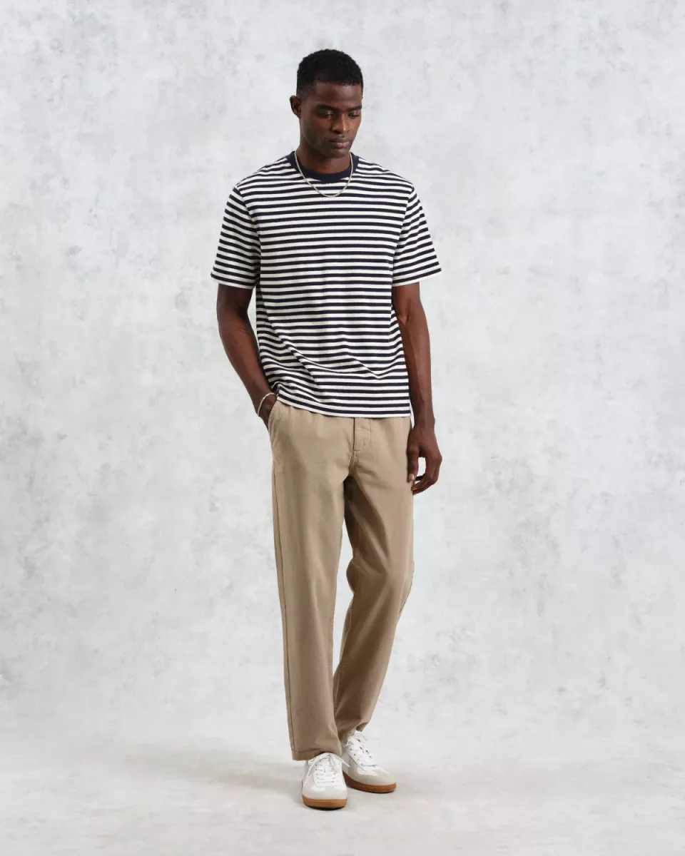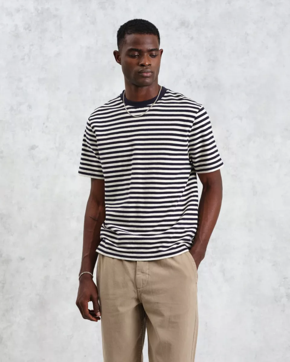 T-shirt met normale pasvorm heeft zijn strepen verdiend. Gemaakt van dezelfde exclusieve, gestructureerde biologische jersey van 280 g, zal deze ecru en donkerblauwe gestreepte uitvoering een onmisbaar item in je T-shirtcollectie worden dit seizoen.