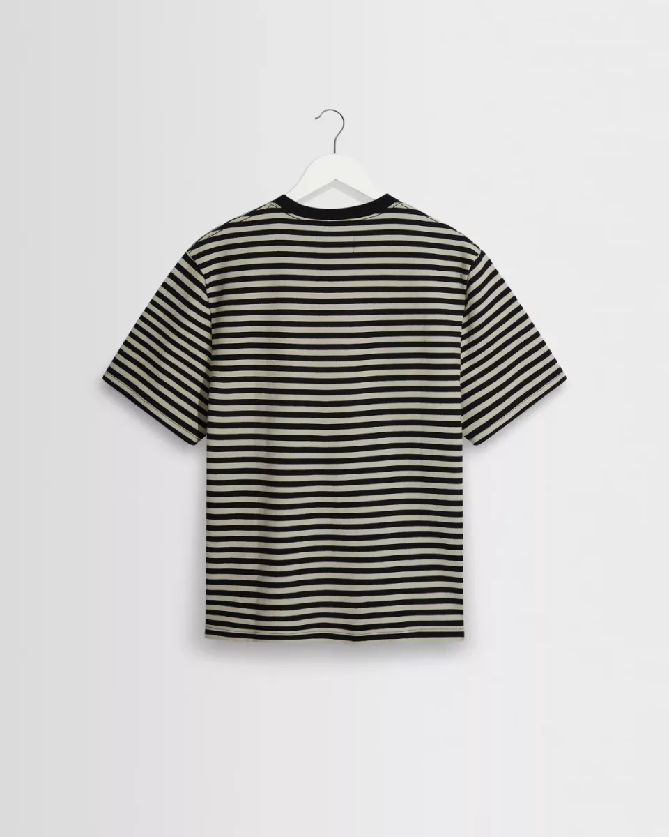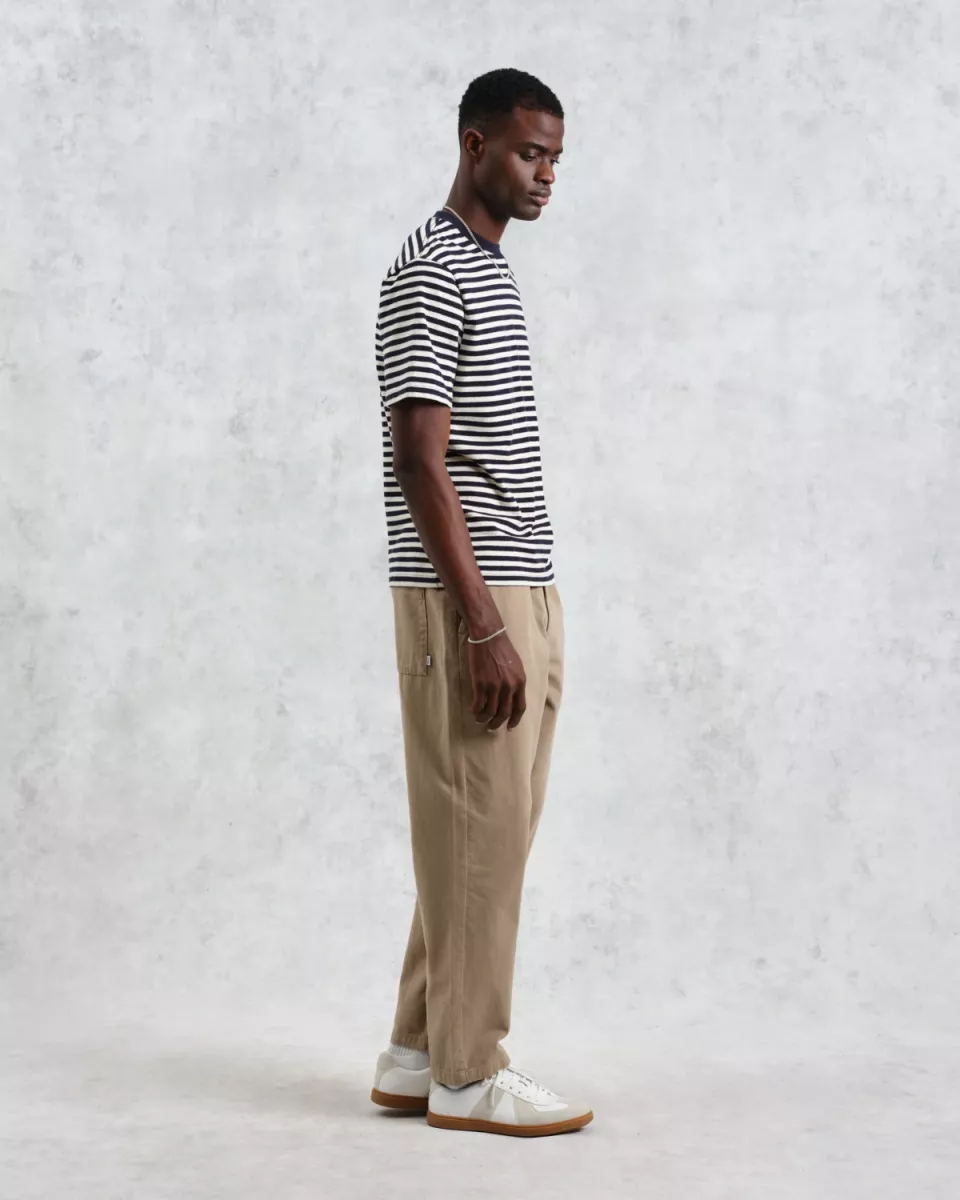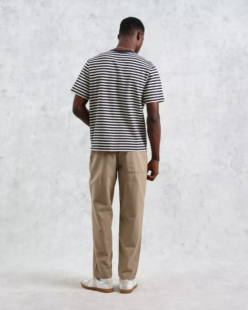 T-shirt met normale pasvorm heeft zijn strepen verdiend. Gemaakt van dezelfde exclusieve, gestructureerde biologische jersey van 280 g, zal deze ecru en donkerblauwe gestreepte uitvoering een onmisbaar item in je T-shirtcollectie worden dit seizoen.