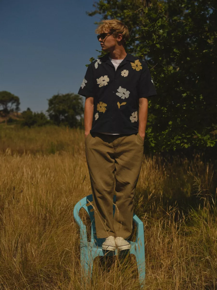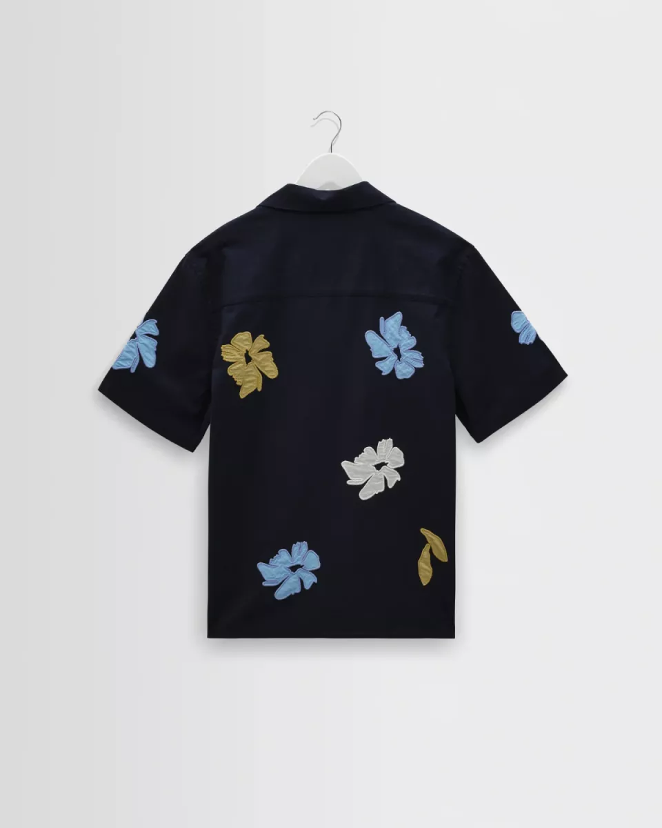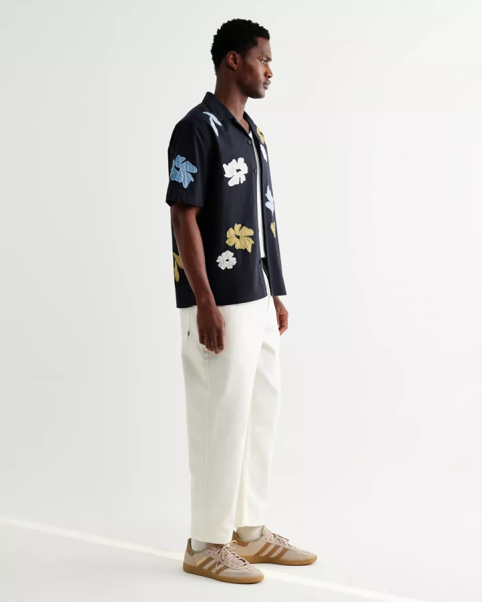 De Didcot is terug in een ademende katoen-linnenmix. De jurk is afgewerkt met botanische applicaties in kaki, ecru en blauw, die textuur en diepte toevoegen aan het ontwerp. De donkerblauwe basis is een stijlvolle basis.