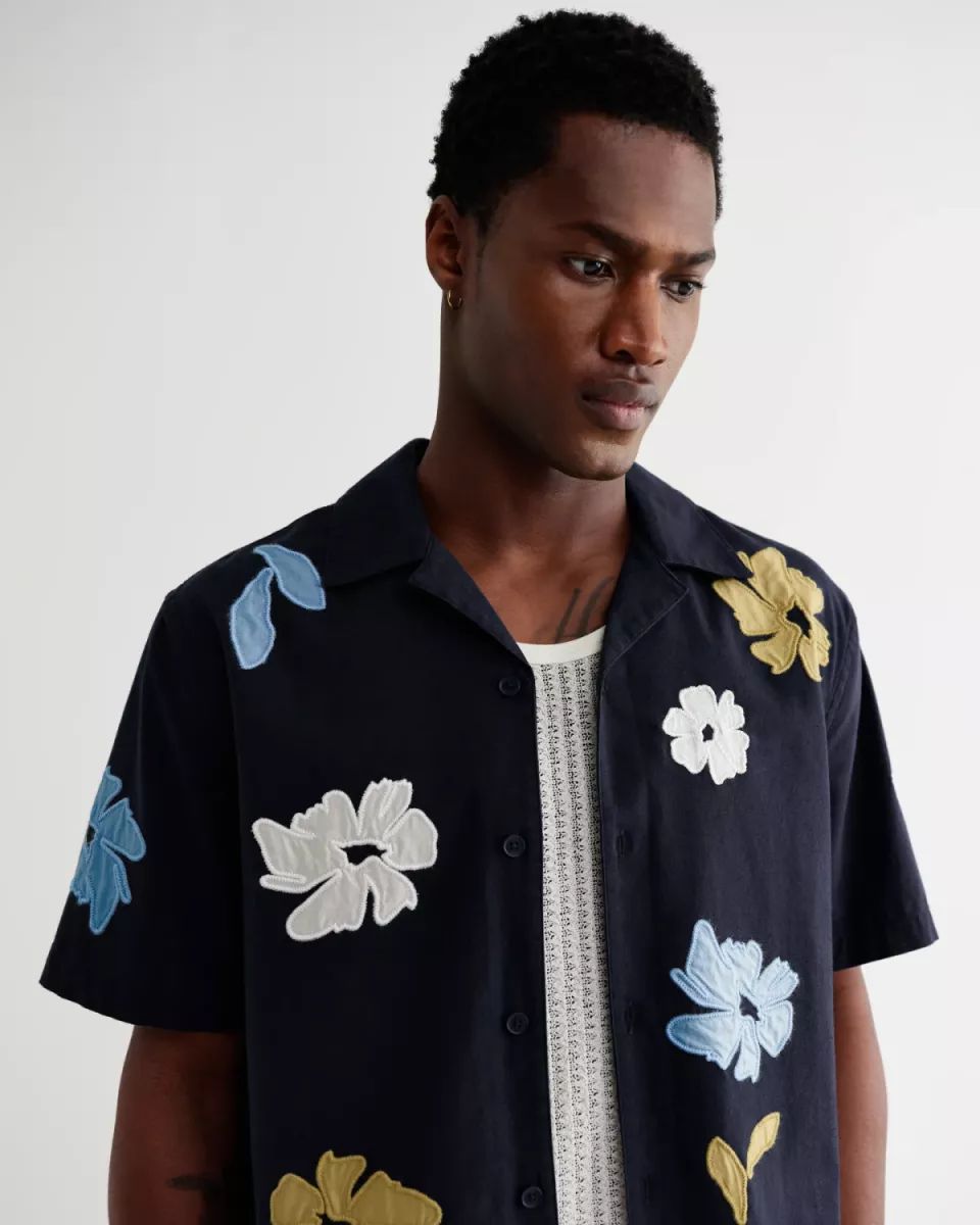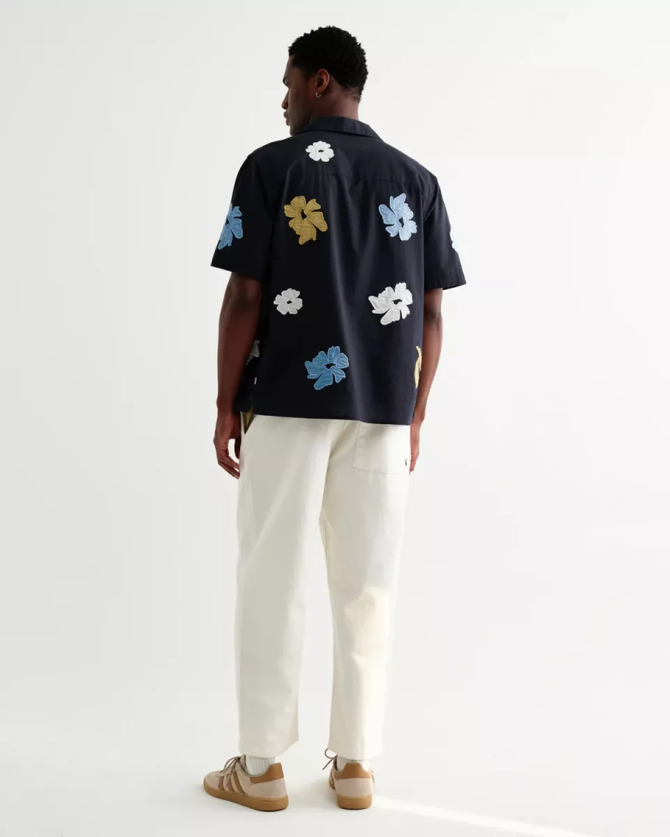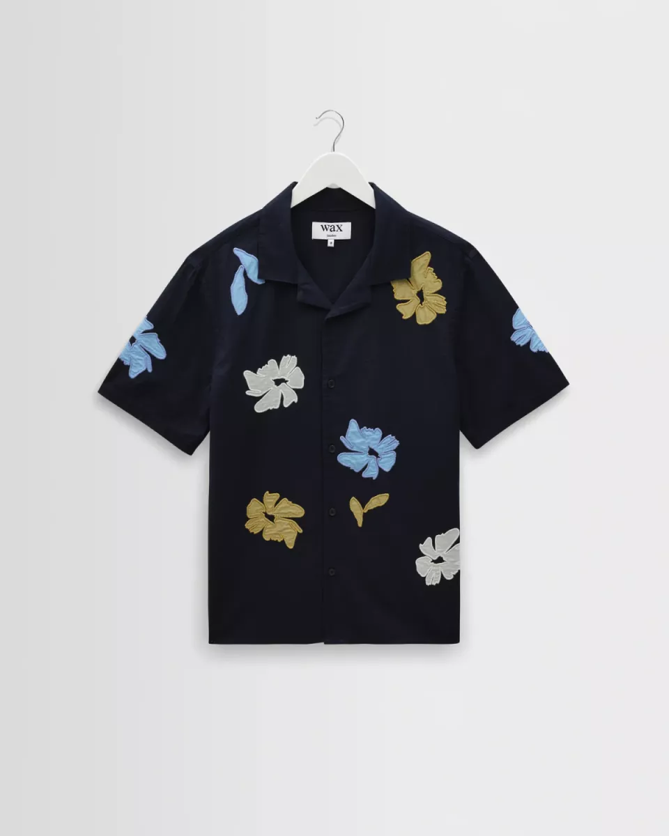 De Didcot is terug in een ademende katoen-linnenmix. De jurk is afgewerkt met botanische applicaties in kaki, ecru en blauw, die textuur en diepte toevoegen aan het ontwerp. De donkerblauwe basis is een stijlvolle basis.