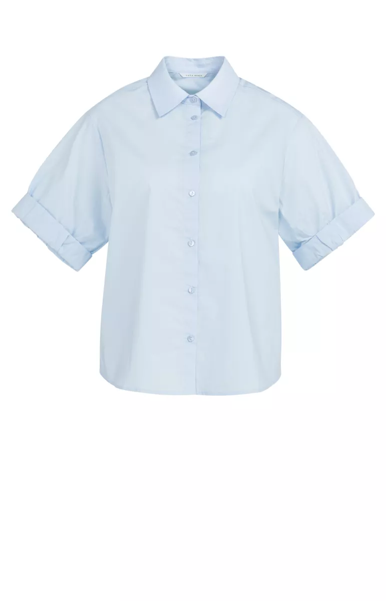 Deze luchtige blauwe blouse is gemaakt van katoen en heeft korte mouwen met een omgeslagen detail. De klassieke kraag en losse pasvorm geven een tijdloze uitstraling. De blouse valt op heuplengte en sluit met knopen aan de voorkant. Perfect te combineren voor een casual of geklede look. Het model is 175 cm en draagt maat 36.